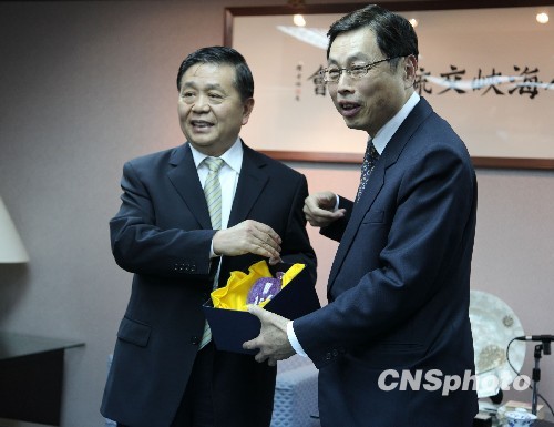 由海协会副会长王富卿率领的海协会民族暨宗教交流访问团一行3月18日抵达台北。图为王富卿(左)一行18日晚前往海基会拜访,受到海基会副董事长兼秘书长高孔廉(右)的接待,高孔廉向王富卿赠送一只仿宋钧窑瓷瓶。