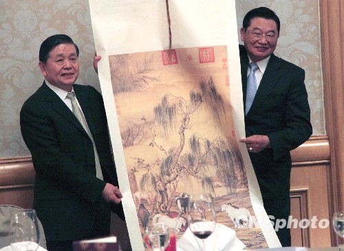 图为宴会前江丙坤(右)向王富卿(左)赠送仿制古画《八骏图》。中新社发 耿军 摄