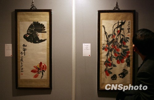 3月17日,一位观者在中国嘉德四季21期拍卖会预展上观看齐白石画作。据法国艺术数据公司“艺术价格”(Art Price)根据从全球6000间拍卖行收集、最新数据发布的2009年全球艺术品销售排行榜,安迪·沃霍尔、毕加索作品在2009年的拍卖销售额分别为1.06亿美元和1.21亿美元,稳坐亚军、冠军宝座,而齐白石以超过7000万美元的销售额排行第三。中新社发 杨可佳 摄