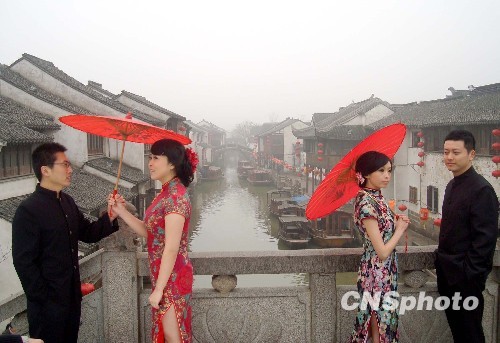 阳春三月,苏州市山塘古街“小桥、流水、人家”的水乡风貌不仅吸引了许多中外游客前来观光游览,更成为不少年轻人及当地影楼拍摄婚纱写真照的“天然摄影棚”。