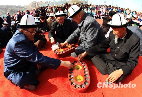 图为几位柯尔克孜族老人聚在一起玩该民族古老的智力型竞技游戏——托古孜库尔果勒(九槽棋)。中新社发 刘新 摄