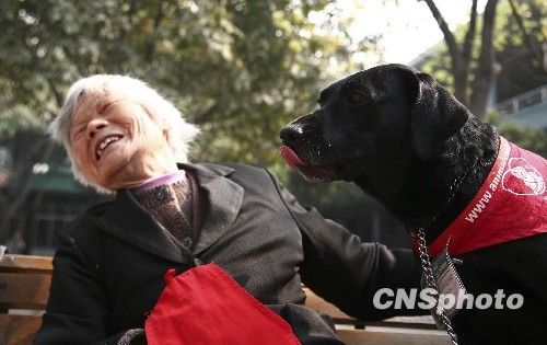 3月19日,亚洲动物基金“狗医生”项目在成都的四只工作犬齐赴成都的一家养老院送去慰问,该项目活动旨在提高大家对动物福利重要性的认识,向人类证明狗也可以成为人类有价值的伴侣和帮手,并最终解决虐杀猫狗作为食物的问题,同时也为养老院的老人孤寂的生活带来温暖。图为“狗医生”大黑向养老院老人表示亲近。中新社发 张浪 摄