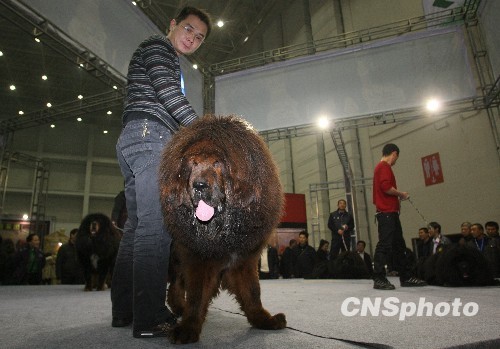 3月19日,首届中国藏獒文化节在北京开幕,全国数百条极品藏獒齐聚一堂。图为藏獒在工作人员带领下站在展台上大秀身姿。中新社发 苏丹 摄