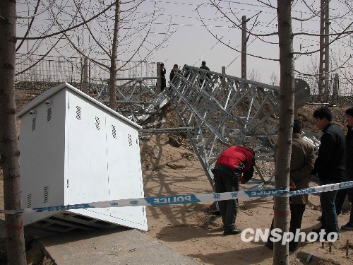 3月20日8时许,京广铁路河北定州段一在建通信塔突然倒塌,致该路段列车一度停运,石家庄及保定火车站众多旅客出行受租。目前,事故原因正在调查中。此前曾有消息称,由于当日的强风导致列车运行电网故障,石家庄至北京区间列车全部停运。截至11时,经过及时抢修,石家庄火车站北京方向的所有线路已经开通,运营恢复正常。图为铁路线西侧倒塌的在建通信塔。中新社发 吕子豪 摄