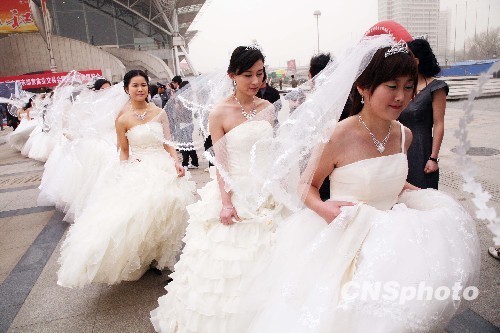 3月20日,数十位“世博新娘”在第二届中国南京婚庆文化博览会上亮相,为展会做宣传,吸引众多南京市民和参观者。据悉,她们是上海世博局与法国馆在全球征集的2010位“世博新娘”中的代表。中新社发 钟山 摄