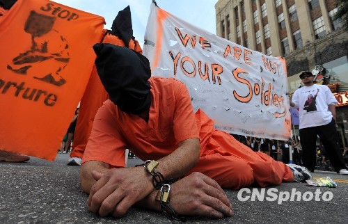 当地时间3月20日,数千名抗议人士在洛杉矶好莱坞大道举行反战大游行。图为抗议者模仿美军虐囚事件。中新社发 张炜 摄