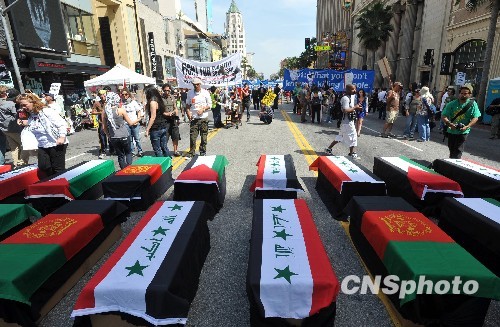 图为覆盖着伊拉克和阿富汗等国国旗的模拟棺材出现在游行队伍中。中新社发 张炜 摄