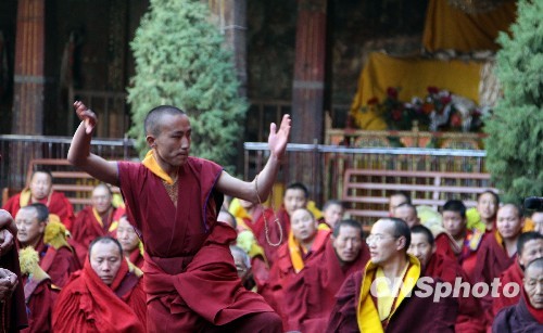 西藏2010年度藏传佛教学经僧人晋升格西拉让巴颁证仪式3月21日上午在拉萨大昭寺举行。今年共有9名学经僧人获得格西拉让巴学衔。图为现场辩经。中新社发 徐长安 摄