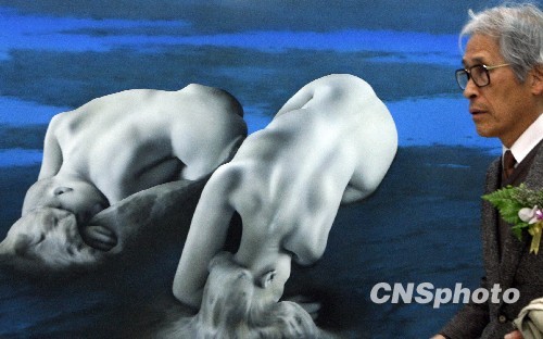 3月21日,由中国美术馆主办的“虚幻的蓝天——日本著名画家森秀雄作品展”在北京中国美术馆开幕,森秀雄1935年出生于日本三重县,毕业于东京艺术大学,初攻油画,后采用喷枪喷射颜料绘画的油彩喷枪绘画法创作作品,逐步形成了独特的绘画技法和风格,成为一位富有创造个性的日本画家。他的绘画以构筑梦境般的手法将不同的景物置入同一个画面,展现出充沛的想象力,其作品通过以蓝色基调为主的色彩构筑成无限的空间,让人产生诗意的联想。作品中既有古典经典名作中的造型,也有大海、山崖、岩石、溪流、浪花、湛蓝色天空中漂浮的白云,既有共同的基调,又有变幻的篇章。图为日本著名画家森秀雄作品展吸引众多观赏者。中新社发 钱兴强 摄