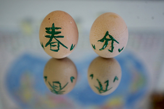 安徽省淮北市市民正在把鸡蛋立起来。王文 摄