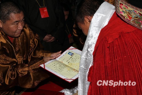 图为考评委员会主人、中国佛教协会西藏分会会长珠康·土登克珠(左)向获得学位的考僧们献哈达,并颁发学位证书。中新社发 徐长安 摄