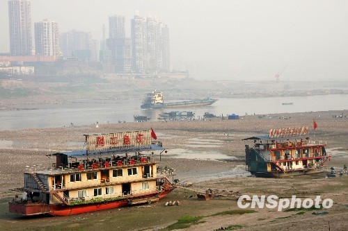 3月20日,一艘货船行驶在长江重庆鹅公岩水域,近处2艘餐饮渔船搁浅至裸露的河床上。近日,受去冬今春西南地区干旱及三峡大坝水位消落影响,长江、嘉陵江重庆段水位仍在下降。截至3月21日14时,长江重庆段寸滩水位为159.47米;嘉陵江重庆段北碚水位为173.47米。中新社发 赵俊超 摄