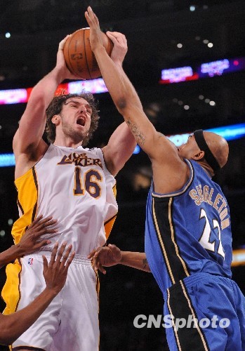 当地时间3月21日晚,洛杉矶湖人在主场以99比92击败华盛顿奇才,取得六连胜。保罗·加索尔(左)拿下全场最高分28分,同时进帐12个篮板球。中新社发 张炜 摄