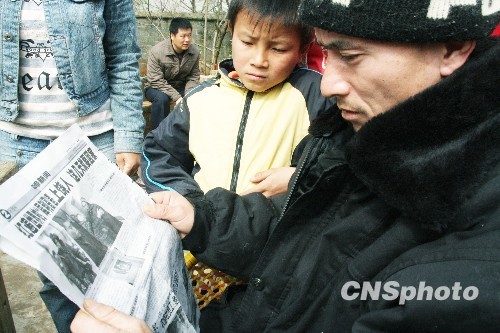“犀利哥”程国荣在认真观看媒体对自己的有关报道。 中新社发 卓忠伟 摄