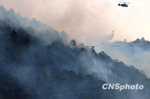 3月22日,距离云南丽江市14公里的玉龙县新团村附近山林发生火灾,火势凶猛,浓烟冲天。火灾发生后,当地武警古城森林中队和林业工作人员及时赶赴火灾现场灭火,数架直升飞机轮番在空中向火场洒水。据当地村民称,起火山林主要为松树,以前从未发生过火灾。导致火灾的原因可能与近来当地持续大旱有关。截止目前,火势未见减弱,真正起火原因有待进一步查明。中新社发 潘旭临 摄