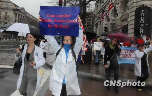 数百名来自美国各地的医生22日冒雨在首都华盛顿集会游行,游行者高呼“改革,不能再等”、“感谢佩洛西”等口号,载歌载舞庆祝美国众议院21日深夜通过医疗改革法案。