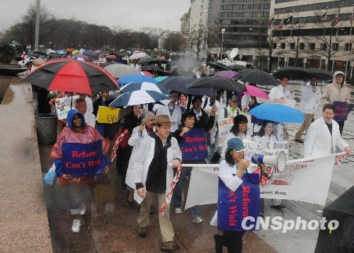 美国医生冒雨游行支持众院通过医改法案 (3)