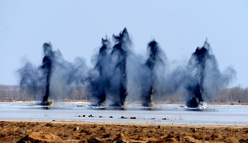 3月22日,北京军区某部炮兵连在内蒙古自治区黄河土默特右旗皿己卜险工河段进行炮击破冰分凌,将淤积在河道中高1.5米左右的冰坝炸碎,成功破冰疏通河道,以迎接大规模的凌汛到来。这是我国炮兵部队连续第三年协助内蒙古自治区破冰除险,疏导黄河流凌。