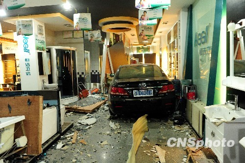 2010年3月22日晚9点,海南琼海市先锋城附近十字路口处,一辆小轿车失控冲进浴具商店。据悉,所幸当时商店已经打烊,未造成人员伤亡,但店里的一片狼藉。