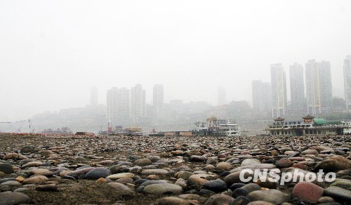 2010年3月23日,重庆市朝天门嘉陵江与长江交汇处大面积河床裸露出来,部分水段已见底。受去冬今春西南地区干旱影响,长江、嘉陵江重庆段水位持续下降。截止3月22日,长江重庆段水位退落至0.31米,比去年同期低了近2米。中新社发 孟幻 摄