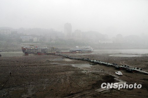 2010年3月23日,重庆市朝天门嘉陵江与长江交汇处大面积河床裸露出来,部分水段已见底。受去冬今春西南地区干旱影响,长江、嘉陵江重庆段水位持续下降。截止3月22日,长江重庆段水位退落至0.31米,比去年同期低了近2米。图为一长串的浮桥搁浅在河床上。中新社发 孟幻 摄
