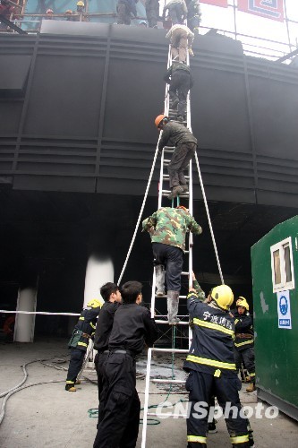 图为消防官兵正在利用拉梯疏散。中新社发 何蒋勇 摄