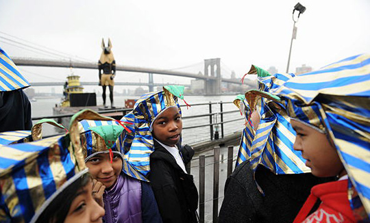 美国纽约一所学校的学生迎接被装载在船上运送到纽约的埃及阿努比斯神雕像复制品。