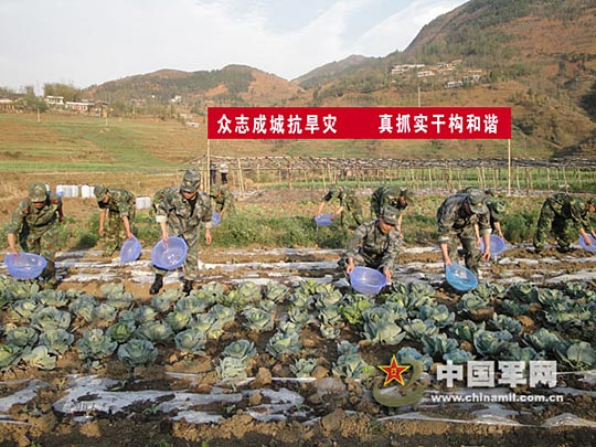 自2009年8月以来,普安县高温、干旱天气持久,降雨量比2009年同期少364毫米,给农作物带来严峻的挑战。据统计,全县农作物受灾面积达8万余亩,直接经济损失1000余万元。旱情发生后,普安县人武部党委及时向14个乡镇武装部下达《民兵参加抗旱救灾紧急通知》。3月13日,机关干部职工、民兵常备应急分队22人在部长解传才的带领下,再次投入到旱灾严重的窝沿乡关田村帮助群众浇灌四季豆、马铃薯、早熟玉米、牛心菜等农作物,为防止气温高时浇水给农作物带来反作用,确保蔬菜的成活率。部长解传才将人员分成二组,一组负责到3公里外取水,另一组负责在菜地挖水沟,把水储存起来,待气温降低后,对每颗菜进行细心的浇灌,经过一天的辛劳,晚上8:10分终于将4亩蔬菜地浇灌完。吴芳奎 保艳宏 摄