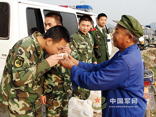 3月13日,武警百色市边防支队十一支队“抗旱小分队”为受灾最严重的广西那坡县果梨村规林屯送水时,村民李大爷给官兵递上茶水说:“你们给我们送来的是救命水,感谢党和政府的关怀、感谢人民子弟兵!”。黄旭恒 赵园毕 摄