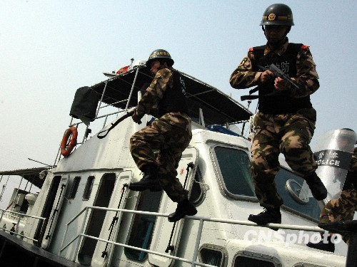 连日来,浙江温州边防支队组织船艇官兵开展海上跳帮战术训练,提高部队处置海上突发事件和协同抓捕能力,全力备战上海世博会“环沪护城河”安保工作。图为温州边防官兵进行海上快速跳帮训练。中新社发 吴水斌 摄