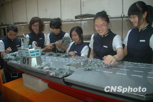 图为航母模型吸引前来参观的大学生。中新社发 尹海明 摄