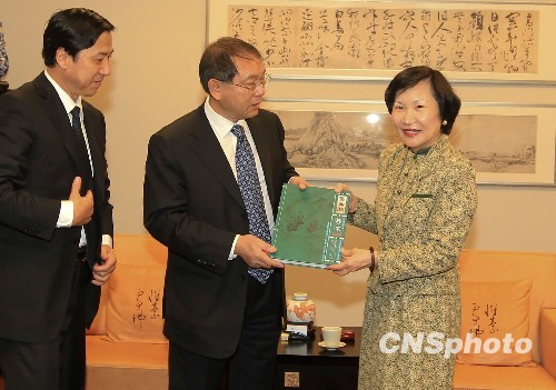 3月24日上午,率团在台北举办“2010台湾·感知多彩贵州”活动的贵州省副省长谢庆生(中),到台北故宫博物院参访,将贵州人民出版社出版的《百苗图》一书赠送给院長周功鑫(右)。中新社发 卢现艺 摄