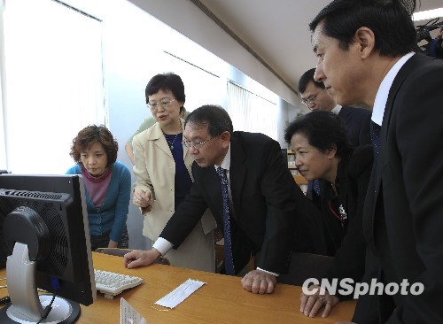 3月24日上午,率团在台北举办“2010台湾·感知多彩贵州”活动的贵州省副省长谢庆生(左三),到台北故宫参访,在台北故宫工作人员陪同下查阅有关贵州苗族的善本资料。中新社发 卢现艺 摄