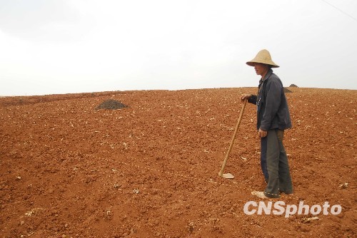 图为山区农民铲除不见芽头的冬麦,重新平整受旱土地,积极备种其他粮食作物。中新社发 田洪 摄