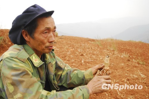 图为块河村委会大岔路小组组长看着去年种下的豌豆完全枯死在地里,眼泪直往下掉。中新社发 田洪 摄