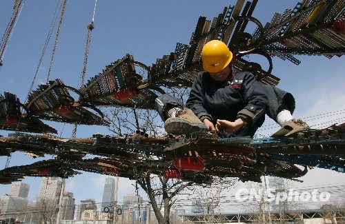 3月25日,工人在北京用建筑废料拼装成凤凰的形象,它们将于4月中旬被运至上海世博会中国馆的主题大厅。中新社发 苏丹 摄