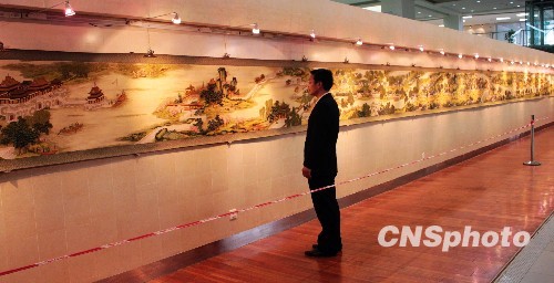 3月25日,堪称目前世界上最长的十字绣艺术品《清明上河图》亮相深圳,这幅作品吸引了许多观众的目光。 这幅十字绣《清明上河图》采用"古绢"为底,纯手绘制。绣品全卷长22米,总使用绣线116505米,2032611针,整幅长卷重约20.6公斤,细分为14个部分。据介绍,此刺绣工程自2008年7月20日起,18位专业高级绣师历时180多天,共绣制出814人,牲畜83匹,船只29艘,房屋楼宇30多栋,车13辆,轿8顶,桥17座,树木180棵。