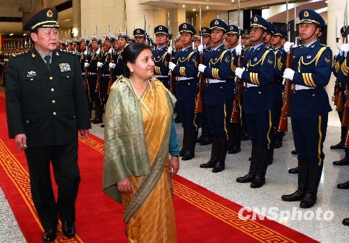 3月25日下午,国务委员兼国防部长梁光烈上将,在北京八一大楼为来华访问的尼泊尔国防部长比迪娅·德维·班达里举行隆重的欢迎仪式,陪同检阅解放军三军仪仗队。中新社发 宋吉河 摄
