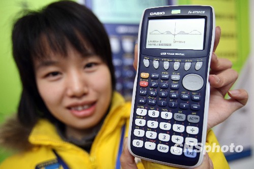 工作人员展示一款图形计算器。具有常规运算、统计、图形、图表、方程求解等功能。中新社发 陈晓根 摄