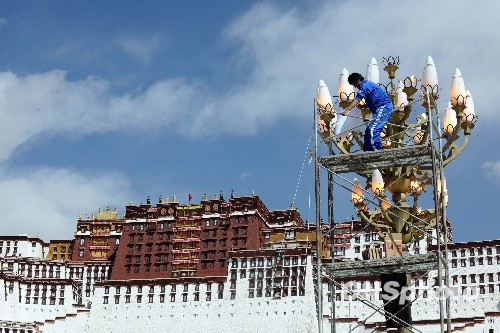 近日,随着“西藏百万农奴解放纪念日”设立一周年日益临近,西藏拉萨布达拉宫广场管理处工作人员开始更换广场街灯的灯泡,迎接节日的到来。中新社发 旦增 摄