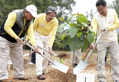 3月27日,香港植树日典礼在西贡蕉坑举行,本着“美化香港、树木树人”的宗旨,香港植树日筹备委员会主席董赵洪娉带领筹委会自1998年初开始举办植树日活动,迄今已历十二载。图为参加当日植树典礼的香港特区财政司司长曾俊华、外交部驻香港特别行政区特派员吕新华等在植树。中新社发 张勤 摄