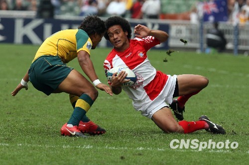 3月27日,2010香港国际七人橄榄球赛进行分组赛。澳大利亚队(黄)与汤加队(白)在场上争夺激烈,状似顶牛。中新社发 郑祚声 摄