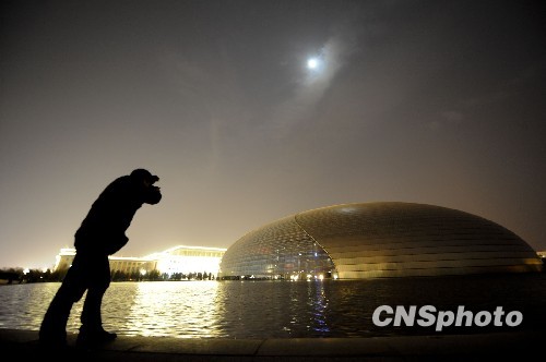 3月27日20点16分,熄灯前许多青年在灯火通明的国家大剧院周围锻炼。当晚,北京国家大剧院参与全球“关灯一小时”活动于20点30分关闭外景灯光。图为记者关注熄灯后的国家大剧院。中新社发 廖攀 摄