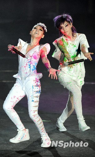 图为小S、范晓萱浑身沾满荧光颜料,状况惨烈还不忘劲歌热舞。中新社发 李学仕 摄