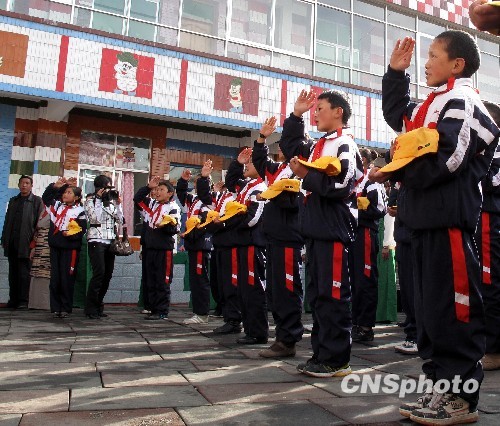 图为拉萨市西郊当巴社区的孩子在校园参加升旗仪式。中新社发 刘舒凌 摄