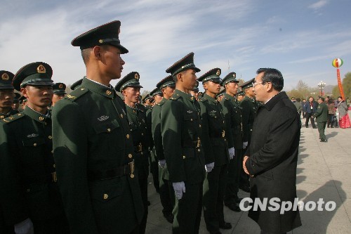 3月28日,西藏百万农奴解放纪念日升旗仪式后,西藏自治区党委书记张庆黎在布达拉宫广场慰问驻藏人民解放军。中新社发 苏丹 摄