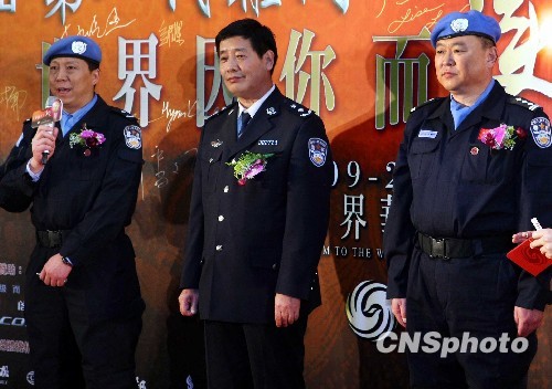 3月27日晚,"世界因你而美丽——2009-2010影响世界华人盛典"颁奖礼在北京大学百周年纪念讲堂举行。图为获得影响世界华人大奖的中国驻海地维和警察登场亮相。中新社发 宋吉河 摄