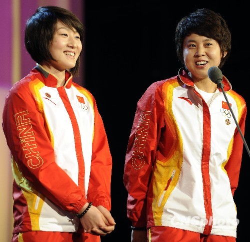 凤凰卫视及中国新闻社联合十余家海内外知名华文媒体及机构共同主办的“世界因你而美丽——2009-2010影响世界华人盛典”于3月27日晚在北京大学举行。盛典向陈香梅、卢燕、高锟、潘文石、吴宇森、蔡国强、中国花样滑冰队、中国女子短道速滑队、驻海地维和警察、孔子学院、薛来、林晨阳、李贤基等颁出“影响世界华人大奖”。图为王濛(右)和队友孙琳琳登台发表获奖感言。中新社发 刘震 摄