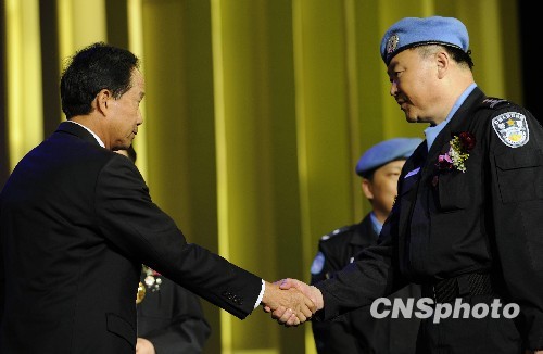 图为前公安部长、最高人民检察院检察长贾春旺向驻海地维和警察代表颁奖。中新社发 刘震 摄