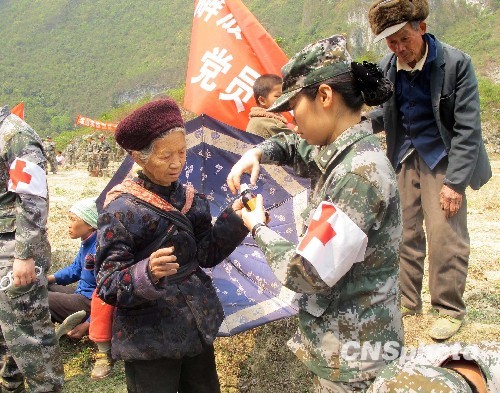 图为军医在广西河池巴马瑶族自治县长乐镇华享村为村民送医送药送温暧。中新社发 夏志勇 摄